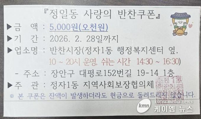 (케이엠뉴스) 수원시 장안구 정자1동 지역사회보장협의체는 금년부터 관내 취약계층 가구를 대상으로 매월 5가구에 2만원 상당의 반찬쿠폰을 지급하는 사업을 시작한다고 지난 13일 밝혔다.