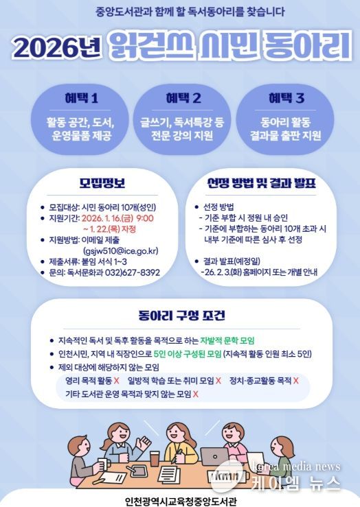 (케이엠뉴스) 인천광역시교육청중앙도서관은 지역사회 독서문화 확산과 시민의 자발적 독서활동 지원을 위해 ‘읽걷쓰 시민 동아리’를 16일부터 모집한다.