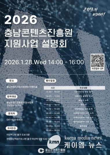 (케이엠뉴스) (재)충남콘텐츠진흥원(원장 김곡미)은 오는 1월 28일 오후 2시, 충남콘텐츠기업지원센터 이벤트홀에서 ‘2026년 지원사업 설명회’를 개최한다고 밝혔다.