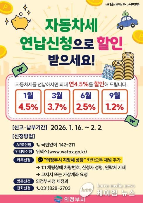 (케이엠뉴스) 의정부시는 자동차세를 1월에 연납으로 납부하면 연간 세액의 최대 4.5%를 공제받을 수 있다고 밝혔다.