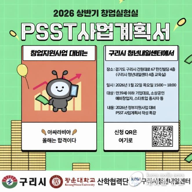 (케이엠뉴스) 구리시는 오는 1월 21일까지 구리시 청년내일센터에서 운영하는‘창업실험실 프로그램’에 참여할 청년을 모집한다고 밝혔다.