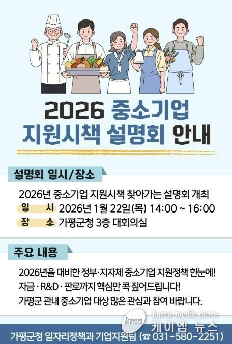 (케이엠뉴스) 가평군이 관내 중소기업의 경영 안정과 경쟁력 강화를 위해 새해 정부의 지원시책을 한자리에 모아 안내하는 설명회를 연다.