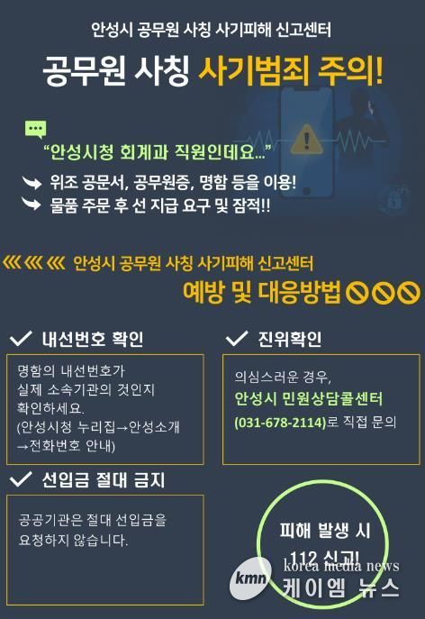 안성시 관계자는 “안성시 공무원은 어떠한 경우에도 선입금을 요구하지 않는다”며 “수상하거나 의심스러운 연락을 받았을 경우, 즉시 신고센터로 문의해 달라”고 당부했다.