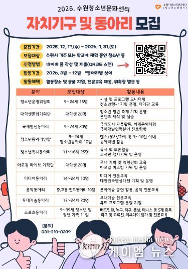 (케이엠뉴스) 수원시청소년청년재단 수원청소년문화센터는 청소년의 자치 역량 강화와 문화 활동 참여 확대를 위해 '2026년 수원청소년문화센터 자치기구 및 동아리' 단원을 모집한다.