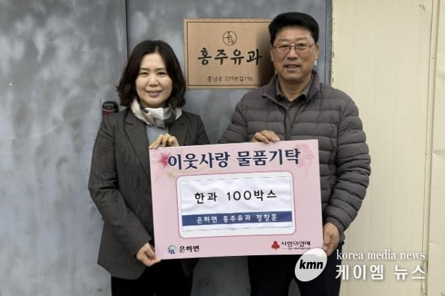 지난 15일 은하면은 희망2026 나눔캠페인 현물기탁식 행사를 추진하여 ㈜홍주유과에 감사의 마음을 전달했고, 기부받은 한과 100박스는 은하면의 저소득층·취약계층 가구 등에 전달될 예정이다.