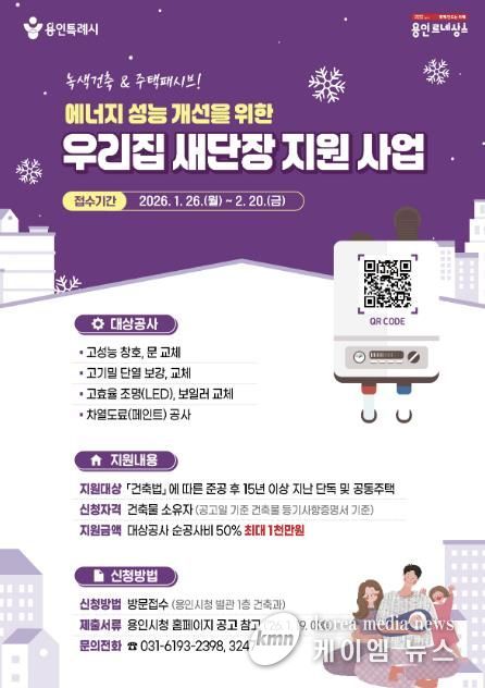 (케이엠뉴스) 용인특례시가 오는 26일부터 2월 20일까지 노후주택 에너지 효율 개선 지원 사업인 ‘우리집 새단장 지원사업’ 신청을 받는다고 16일 밝혔다.