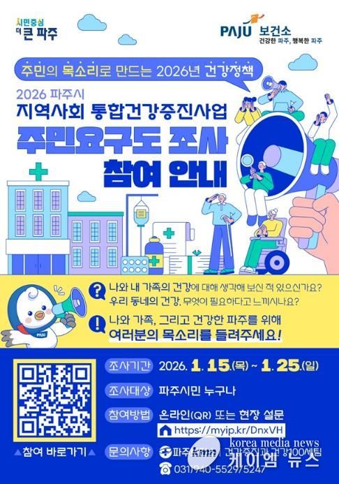 (케이엠뉴스) 파주시는 시민의 건강한 삶을 지원하기 위해 '2026년 지역사회 통합건강증진사업’추진에 앞서 주민건강요구도 조사를 실시한다.