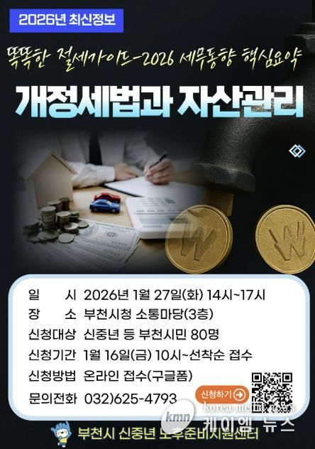 (케이엠뉴스) 부천시는 1월 27일 시청 3층 소통마당에서 ‘2026년 개정세법과 자산관리’ 재무특강을 진행한다. 이번 특강은 오후 2시부터 5시까지 부천시민 80명을 대상으로 무료로 진행되며, 신중년의 자산관리 역량을 높이고 안정적인 노후설계를 지원하기 위해 마련됐다.
