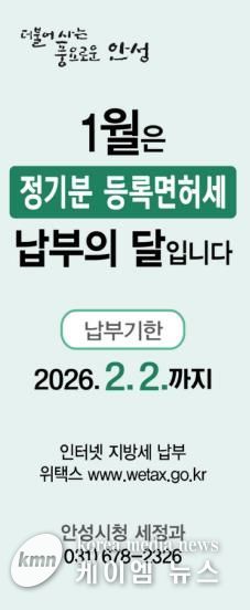 안성시 관계자는 “등록면허세 납부기한은 2월 2일까지로, 납기 마지막 날에는 민원인이 몰려 혼잡하거나 온라인 접속이 지연될 수 있으므로 조기 납부를 부탁드린다”고 당부했다.