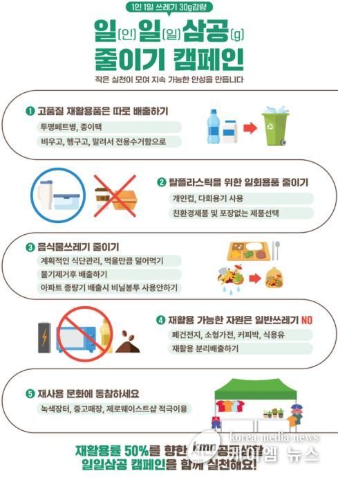 (케이엠뉴스) 안성시는 시민의 자발적인 실천을 통해 재활용률을 높이고 생활쓰레기 발생량을 줄이기 위한 ‘1인 1일 쓰레기 30그램 줄이기(일일삼공) 캠페인’을 적극 추진하고 있다고 밝혔다.