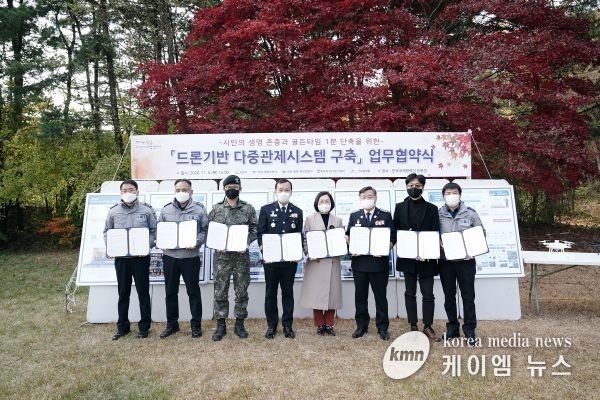 (케이엠뉴스) 성남시는 5일 오후 2시 한국국제협력단 운동장에서 분당·수정·중원경찰서 성남·분당소방서 55사단 3대대, SK텔레콤과 재난안전 격차 해소와 재난·안전관리체계 확보를 위해 ‘드론 기반 다중관제시스템 구축을 위한 업무협약’을 맺었다.