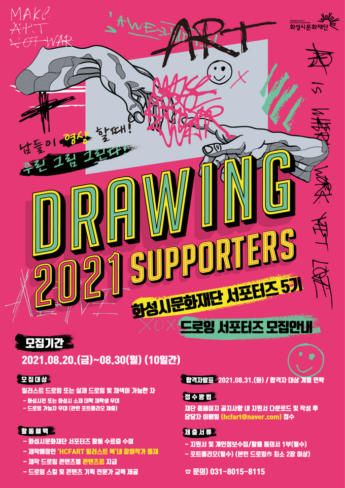 (재)화성시문화재단(대표이사 이종원)은 홍보 활성화 및 시민들에게 새로운 예술활동 기회를 제공하기 위해 8월 20일(금)부터 30일(월)까지 화성시문화재단 드로잉 콘텐츠를 기획‧제작할 서포터즈 5기 ‘드로잉 서포터즈’를 모집한다.