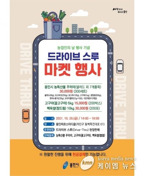 시는 오는 29일 오후 2~4시 처인구 삼가동 용인미르스타디움에서 드라이브 스루 마켓을 열고 관내 농가에서 생산한 샐러드채소·표고버섯·풋고추·고구마·생땅콩·현미누룽지·오미자젤리·구운계란 등 8종이 들어있는 농특산물 꾸러미와 고구마, 백옥쌀 등 3개 품목을 판매한다.