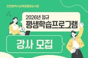 (케이엠뉴스) 인천광역시교육청중앙도서관은 지역 주민에게 다양한 학습 기회를 제공하기 위해 ‘2026년 평생학습프로그램’ 강사를 공개 모집한다. 2026년 정규 평생학습프로그램은 상반기(3~5월)와 하반기(9~11월)로 나뉘어 각각 8회씩 운영되며, 모집 분야는 유아 대상 독후활동, 초등 1~2학년 대상 초등 영어, 성인 대상 AI 활용과 동영상 제작, 우쿨렐레, 금융·경제 등 총 5개 분야다. 서류 접수는 12월 23일부터 29일 오후 5시까지이며, 중앙도서관 누리집 공지사항에서 제출 서식을 내려받아 작성한 뒤 관련 서류와 함께 이메일로 제출하면 된다. 강사는 1차 서류심사와 2차 면접심사를 거쳐 최종 선정된다. 자세한 사항은 중앙도서관 누리집에서 확인할 수 있으며, 문의는 마을교육지원과로 하면 된다.