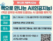 (케이엠뉴스) 인천광역시교육청서구도서관에서는 어린이들의 인공지능(AI) 이해를 높이고 창의적 문제해결 능력을 기르기 위한 제112회 겨울 독서교실 ‘책으로 만나는 AI’를 운영한다. 이번 프로그램은 초등학교 4학년 어린이 25명을 대상으로 2026년 1월 14일부터 16일까지 가재울꿈어린이도서관에서 진행된다. 참여 어린이들은 인공지능(AI)과의 상호작용을 기반으로 미래 사회에 필요한 역량을 다양한 독서와 체험 활동으로 직접 경험하게 된다. 인공지능 플랫폼 탐색, 연계선정도서 읽기 및 독서토론, 그림 생성형 인공지능 체험 및 창작 활동, 그림책 ‘대답없는 AI’ 감상 후 로봇 네온아트 만들기 등 인공지능 기술을 활용한 다양한 프로그램이 마련돼 있다. 참가를 원하는 어린이는 12월 15일 오전 10시부터 서구도서관 누리집에서 신청할 수 있으며, 자세한 사항은 서구도서관 누리집 또는 어린이자료실로 문의하면 된다.