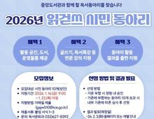 (케이엠뉴스) 인천광역시교육청중앙도서관은 지역사회 독서문화 확산과 시민의 자발적 독서활동 지원을 위해 ‘읽걷쓰 시민 동아리’를 16일부터 모집한다. ‘시민 동아리’는 도서관을 중심으로 읽고 걷고 쓰는 활동을 하는 독서 모임으로, 선정된 동아리에는 운영에 필요한 도서와 물품, 활동 장소, 동아리 특성에 맞는 특강을 지원하며 동아리 활동 결과물은 책자로 발간할 예정이다. 인천시민 5명 이상으로 구성된 자발적이고 지속적인 독서 모임이면 동아리 신청이 가능하며 자세한 사항은 중앙도서관 누리집 공지사항에서 확인하면 된다. 도서관 관계자는 “시민이 동아리 활동을 통해 지역공동체 문화를 향유하고 책을 주제로 다양한 생각을 나누며 공감대를 형성해 행복한 책 읽기 문화가 확산되기를 바란다”고 말했다.