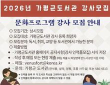 (케이엠뉴스) 가평군도서관은 2026년 도서관 문화프로그램을 운영할 강사를 공개 모집한다고 11일 밝혔다. 모집 대상은 가평군도서관 문화프로그램 운영을 희망하는 강사로 거주지 제한은 없으나 가평군 거주자 또는 인근 지역의 강사를 우선 모집한다. 모집 분야는 유아부터 성인을 대상으로 하는 독서문화 프로그램을 비롯해 취미, 교양, 체험 등 도서관에서 운영 가능한 분야이다. 모집 기간은 올해 12월부터 상시 모집하고 있으며 제출서류를 준비해 가평군 도서관 4개소(한석봉, 설악, 청평, 조종)에 방문 또는 가평군도서관 홈페이지 공지사항에 기재된 이메일로 제출하면 된다. 제출된 서류는 가평군도서관 강사인력풀에 등록 및 관리되며, 추후 도서관 문화 프로그램 운영을 위한 강사로 활동할 수 있다. 기타 자세한 내용은 가평군도서관 홈페이지 공지사항을 참고하거나 가평군도서관으로 문의하면 안내받을 수 있다. 도서관 관계자는 “이번 공개 모집을 통해 유능하고 열정 있는 강사를 모집해 지역 주민에게 다양하고 유익한 프로그램이 운영될 수 있도록 최선의 노력을 하겠다”고 밝혔다.