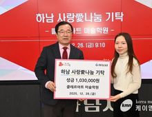(케이엠뉴스) 하남시는 지난 26일, 미사3동에 위치한 클레르아트 미술학원(원장 김수빈)이 작품 전시회 수익금(103만원)을 ‘하남 사랑愛나눔’ 성금으로 기탁하며, 나눔을 실천했다고 밝혔다. 이날 기탁식에는 이현재 하남시장과 클레르아트 미술학원 김수빈 원장이 참석했다. 이번 성금은 클레르아트 미술학원 수강생 36명이 참여해 직접 그린 작품을 전시ㆍ판매해 마련된 것으로, 지역 내 도움이 필요한 취약아동에게 배분될 예정이다. 김수빈 원장은 “수강생들의 재능이 모여 지역의 아이들에게 따뜻한 온기를 전할 수 있어 기쁘다”며, “앞으로도 재능과 나눔을 연계한 활동을 이어갈 수 있도록 노력하겠다”고 기탁 소감을 밝혔다. 하남시 관계자는 “지역을 위해 나눔을 실천해 주신 클레르아트 미술학원과 수강생들에게 감사드린다”며, “마음이 담긴 소중한 성금은 도움이 필요한 아이들을 위해 뜻깊게 사용하겠다”고 감사 인사를 전했다.