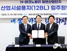 (케이엠뉴스) 화성특례시 H-테크노밸리 일반산업단지에 세계적 기업 삼성전자의 세 번째 첨단 물류거점(CDC, Central Distribution Center)이 들어선다. 시는 9일 시청 중앙회의실에서 삼성전자㈜, ㈜에이치테크노밸리와 ‘첨단 물류거점 조성을 위한 입주협약’을 체결하고, 삼성전자의 H-테크노밸리 일반산업단지 입주를 위해 상호 협력하기로 했다. 이날 협약은 삼성전자가 산업단지 내 산업시설용지(12BL) 약 6만4천㎡를 분양받기 위한 사전절차로, 화성시 및 산업단지 시행사인 ㈜에이치테크노밸리의 적극적인 노력과 삼성전자의 물류 고도화 전략이 맞물려 추진됐다. H-테크노밸리 일반산업단지는 화성시 양감면 요당리 일원에 73만 6천㎡ 규모로 조성 중인 반도체·자동차 부품 특화단지로, 현재 토지 보상을 완료하고 2028년 준공을 목표로 산업시설용지 분양과 단지 조성 공사를 진행하고 있다. 특히, 서해안고속도로 발안IC 및 평택제천고속도로 청북IC와 인접한 탁월한 교통망을 갖추고 있어, 반도체 및 미래차 소부장(소재·부품·장비) 기업들의 핵심 요충지로 떠오르고 있다. 삼성전자는 산업단