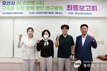 (케이엠뉴스) 오산시의회 의원연구단체인 ‘AI혁신도시 전략 연구회’는 17일 의회 제2회의실에서 오산형 AI 스마트시티 구축을 위한 정책 방안 연구 최종보고회를 개최했다. ‘AI혁신도시 전략 연구회’는 성길용(대표), 이상복, 송진영, 전예슬 의원이 참여했으며, 제윤의정 김범휘 박사 외 2명이 연구를 수행했다. 이번 연구는 AI 기술을 활용한 교육·복지·도시안전·소상공인 분야의 혁신 방안을 중심으로 지난 5개월 동안 추진됐다. 보고회에서는 “오산 시민 모두에게 AI 동반자 한 명”이라는 비전 아래, 오산시의 특성과 역량을 반영한 오산형 AI 모델을 제시했다. 특히 △AI 기반 맞춤형 학습 지원 시스템 구축(교육 분야) △소상공인 대상 ‘AI 점원’ 서비스 및 상권 데이터 허브 조성(경제 분야) △AI 스쿨가드 및 긴급대응 연계 시스템 구축(도시안전 분야) △AI 복지챗봇 및 복지위기 알리미 도입(복지 분야) 등 4대 핵심 추진 전략이 발표됐다. 또한, 연구단체는 180일 단위의 실행 로드맵을 제시하며 오산시의 스마트시티 통합운영센터, AI 코딩에듀랩 등 기존 인프라를 활용한 단계별 추진방안을 구체적