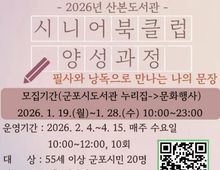 (케이엠뉴스) 군포시산본도서관은 2026년에도 관내 시니어들에게 책을 통해 서로 소통하고 공감하는 능동적 독서교육 프로그램인 ‘시니어 북클럽 양성 과정’을 운영한다고 밝혔다. 이번 교육은 2월 4일부터 4월 15일까지 매주 수요일 오전 10시부터 12시까지 총 10주차로 진행되며 북클럽 운영을 위한 운영법, 글쓰기 방법, 주제도서의 낭독과 필사 등에 대해 교육하여 시니어 독서동아리로 자발적인 활동을 할 수 있도록 실전교육 위주로 진행된다. 산본도서관에서 2025년도에 ‘낭독과 필사로 떠나는 글쓰기 여행’ 수업을 맡았던 최선화 강사가 진행하며 도서관은 교육 기간 중, 신규 시니어 독서동아리를 모집 및 결성하여 지속적인 독서 모임 활동을 지원할 계획이다. 함께 글쓰기 및 독서에 관심있는 관내 55세 이상 시니어라면 누구나 신청 가능하며, 1월 19일부터 선착순으로 20명을 모집한다. 신청은 군포시도서관누리집 문화행사신청 또는 전화 접수가 가능하다. 하은호 군포시장은 “앞으로 산본도서관이 시니어 세대가 책으로 하나 되는 소통공간이 될 수 있도록 다양한 독서교육 프로그램을 운영하겠다”라며 “독서교육을 통해