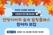 (케이엠뉴스) 파주보건소는 시민들의 건강한 삶을 위한 한의약 건강 증진 프로그램인 ‘한방이어락(樂) 숲속 치유교실(힐링 클래스)’을 오는 25일 10시부터 12시까지 율곡수목원에서 운영한다. 이번 프로그램은 자연 속에서 가족이 함께 건강을 되돌아보고, 숲에서의 명상과 호흡을 통해 스트레스를 해소하고자 기획됐다. 참가자들은 수목원의 맑은 공기와 아름다운 풍경 속에서 지친 몸과 마음을 회복하는 시간을 갖게 된다. 주요 내용은 ▲구절초 숲길 산책 ▲자연 속에서 가족과 추억 만들기 ▲구절초 차 마시기 등 구절초를 주제로 한 다양한 활동으로 구성되어 있다. 신청은 파주시 평생교육포털 누리집(lll.paju.go.kr)을 통해 가능하며, 가족 단위로(4~6가구, 총 20여 명) 선착순 모집한다. 단, 신청 가구가 많을 경우 3대 가족을 우선 선발한다. 이한상 파주보건소장은 “자연과 함께하는 치유 프로그램을 통해 가족 간 유대감을 높이고, 건강한 생활 습관을 기를 수 있는 계기가 되길 바란다”라며 “많은 시민들의 적극적인 참여를 기대한다”라고 밝혔다.