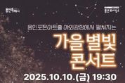 (케이엠뉴스) 용인문화재단은 오는 10월 10일 오후 7시 30분, 새롭게 단장한 용인포은아트홀 야외광장에서 ‘가을 별빛 콘서트’를 개최한다. 이번 공연은 가을밤의 정취 속에서 시민들에게 특별한 추억을 선사하고, 용인의 대표 광장형 축제를 알리기 위해 마련됐다. ‘가을 별빛 콘서트’에는 가수 거미, 유리상자 이세준, 힙합 아티스트 행주·마린·블랙나인, 그리고 소프라노 정나리가 출연해 대중음악·클래식·힙합을 아우르는 다채로운 무대를 선보일 예정이다. 이번 공연은 무료로 진행되며, 사전 댓글 이벤트를 통한 예약석(현재 마감)과 공연 당일 현장 선착순 입장석으로 운영된다. 현장 참여자는 오후 5시부터 대기 후 오후 6시부터 선착순 입장할 수 있으며, 돗자리석과 계단석 등 다양한 방식으로 자유롭게 관람할 수 있다. 특히 이번 ‘가을 별빛 콘서트’는 시민 참여형 현장 이벤트도 마련됐다. 입장객 1,800명에게는 별 모양 무드등이 기념품으로 증정되며, 공연 전에는 중계 카메라 이벤트를 통해 용인포은아트홀 공연 티켓이 제공된다. 본 공연에 앞서 오후 4시부터 예술교육 매개자 ‘아트러너’가 운영하는 문화예술 체험부스가 열린다