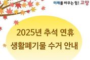 (케이엠뉴스) 고양특례시는 다가오는 추석 연휴를 맞아 시민들이 쾌적하고 깨끗한 환경 속에서 명절을 보낼 수 있도록 ‘추석 연휴 생활쓰레기 관리대책’을 수립해 본격 추진한다. 시는 10월 3일부터 9일까지 연휴 기간 동안 상황반과 기동청소반을 운영해 각종 민원과 긴급 상황에 신속 대응하고, 생활쓰레기와 무단 방치쓰레기를 집중 수거할 예정이다. 아울러 연휴 기간 쓰레기 배출일 사전홍보와 쓰레기 상습 투기 우려지역에 대한 집중 단속도 병행한다. 특히, 10월 8일 대체공휴일에도 생활쓰레기 수거를 정상적으로 실시해 시민 불편을 최소화할 방침이다. 다만, 10월 5일, 6일(월·추석), 7일 3일간은 휴무로 인해 수거가 이뤄지지 않는다. 이에 따라 쓰레기 배출은 반드시 수거일 전날 일몰 이후에 해야한다. 시 관계자는 “쾌적하고 깨끗한 명절 분위기 조성을 위해 추석 연휴 기간 생활쓰레기 수거에 만전을 기하겠다”며 “각 가정에서도 음식물 쓰레기 줄이기, 재활용품 분리배출 등 생활쓰레기 감량에 적극 협조해 주시기를 바란다”고 전했다.