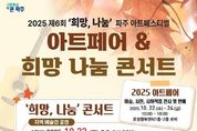 (케이엠뉴스) 파주시가 주최하고 ㈔한국예술문화단체총연합회 파주지회에서 주관하는 '2025 제6회 ‘희망, 나눔’ 파주 아트페스티벌'이 10월 22일부터 24일까지 3일간 운정행복센터에서 개최된다. 올해로 6회를 맞이한 이번 축제는 다양한 분야의 예술을 매개로 온정을 나누고 희망과 행복을 전하기 위해 마련됐으며, 축제를 통해 발생한 수익금은 어려운 이웃에게 전달되고 있다. 축제 기간 동안 운정행복센터에 파주예총 전문 예술인들의 미술, 사진, 시화 작품 등을 전시하고 판매하는 공간이 운영되며, 23일과 24일에는 지역 예술인 및 초청 가수(전원석, 이규석, 녹색지대)들의 공연 ‘희망, 나눔 콘서트’가 개최된다. 공연 시작 전에는 무료로 가족사진 찍어주기 행사가 진행될 예정이다. 유초자 문화예술과장은 “이번 축제가 어려운 환경에 있는 이웃에게 나눔을 전하는 계기가 되기를 소망한다”라며, “일상 속에서 예술을 가까이 만날 수 있는 이번 축제에 시민 여러분의 많은 관심과 참여를 바란다”라고 말했다.