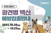 (케이엠뉴스) 고양특례시는 2025년 하반기 광견병 예방접종을 10월 20일부터 실시한다고 밝혔다. 광견병은 주로 야생동물에 의해 전파되며 감염된 반려동물에서 사람에게 전염될 수 있는 치명적인 인수공통전염병이다. 이에 따라 매년 1회 반려동물에게 광견병 예방백신을 접종하는 것이 중요하다. 올해 상반기에 접종을 마친 반려동물의 경우 재접종 하지 않아도 된다. 접종 기간은 오는 10월 20일부터 10월 25일까지로 3개월령 이상 개를 대상으로 광견병 예방접종을 실시한다. 접종 기간 중 반려동물과 함께 거주지 인근 지정 동물병원(37개 병원/고양시 누리집 참조)을 방문하여 무료로 광견병 예방접종을 할 수 있다. 예방접종은 반드시 동물등록이 돼 있어야 지원받을 수 있으며 동물등록을 하지 않은 반려견은 동물병원에서 동물등록(자부담 1만원)하고, 접종을 받으면 된다. 임신 또는 이상 소견이 있는 경우에는 접종이 불가능하므로 사전에 수의사와 충분히 상담해야 한다. 이번 광견병 예방접종 지원에 참여하는 동물병원은 고양시 누리집(정보공개- 고양소식- 새소식 – 광견병 검색)을