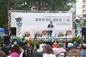(케이엠뉴스) 고양시원흥종합사회복지관은 지난 18일, 도래울마을1단지 중앙공원에서 개관 10주년 기념행사 ‘함께한 우리, 함께한 10년’을 1,000여 명의 주민이 참여한 가운데 성황리에 마무리했다. 이번 행사는 복지관과 함께 도래울마을1단지 내에서 공동체를 이루어온 원흥도래울마을1단지관리사무소와 고양시립원흥어린이집이 협력해 준비했으며, 복지관과 함께해온 지역주민과 자원봉사자, 후원자들에게 감사의 마음을 전하고, 이웃 간 소통과 화합을 도모하기 위해 마련됐다. 다인예술단의 신나는 고고장구와 고양시립합창단의 식전 공연으로 화려하게 막을 올린 이번 행사에는 이동환 고양특례시장, 김성회 국회의원, 경기도와 고양특례시의회 의원, 유관기관 단체장 등 많은 내빈들이 참석해 축하를 전했다. 이어 진행된 표창 수여식에서는 복지관과 함께한 자원봉사자와 후원자들이 감사패를 받았으며, 비전 선포식과 후원 전달식을 통해 앞으로의 10년을 향한 새로운 다짐을 공유했다. 2부 순서에서는 복지관 프로그램 참여자들이 직접 준비한 ▲줌바댄스 ▲합창 ▲하모니카 공연 등 다채로운 무대가 펼쳐져 관객들의 뜨거운 박수를 받았다. 특히