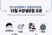 (케이엠뉴스) 경기문화재단 경기상상캠퍼스(대표이사 유정주)는 겨울 시즌 생활창작공방 프로그램 참여자를 오는 17일부터 모집한다. 생활창작공방은 경기상상캠퍼스 생생1990에 위치한 경기생활문화센터 교육 커뮤니티 공간으로, 도민이 일상 속에서 다양한 창작 활동을 경험할 수 있도록 재단공방, 어린이창작공방, 드로잉실, 취미공방, 직물공방, 커피공방, 사진촬영실까지 총 7개의 특화 공간을 운영하고 있다. 11월에는 총 11개의 프로그램이 구성돼 있으며, 주요 프로그램으로는 △Set in wool(울조끼와 가방 만들기), △오롯이 나에게 집중하는 시간: 4주 터프팅 힐링 프로젝트, △내 생애 첫 그림- 알기 쉬운 민화'일월오봉도', △그림책 마음 놀이터 등이 있다. 12월에는 △오일파스텔로 만드는 2026년 달력 △우리들의 예술놀이터, △복을 담는 라탄 복조리 만들기, △복을 쓸어 담는 모시 빗자루 만들기, △커피의 감별과 추출 방법: 커핑까지 총 5개의 프로그램이 운영될 예정이며, 수강 신청은 11월 14일부터 각 프로그램 시작 4일 전까지 경기상상캠퍼스 누리집을 통해 가능하다. 경기상상캠퍼스 내 생활창작