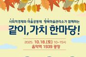 (케이엠뉴스) 가평군은 오는 18일 오전 10시부터 오후 3시까지 음악역 1939 광장에서 주민과 함께하는 축제 ‘2025년 같이, 가치 한마당’을 연다. 이번 행사는 사회적경제기업의 판로 확대와 마을공동체, 경기행복마을관리소의 활동 성과를 알리고 주민 참여를 확대하기 위해 마련됐다. 행사에는 사회적경제기업 5곳, 마을공동체 16곳, 경기행복마을관리소 4곳 등 총 25개 단체가 참여한다. 이날 주민들은 현장에서 직접 사회적경제기업의 제품을 구매할 수 있으며, 공동체별 특색 있는 프로그램을 즐길 수 있다. 주요 프로그램은 △사회적경제기업 생산품 홍보·판매 △공동체와 경기행복마을관리소 활동 전시 및 무료 체험 △합창·뮤지컬 갈라쇼·힐링체조 등 공연 △경품 이벤트 등이 마련돼 있다. 특히 가평마을교육공동체가 제작한 단편영화 상영 등 주민 주도 콘텐츠도 선보일 예정이다. 가평군 관계자는 “‘같이, 가치 한마당’ 축제를 통해 지역사회에서 사회적경제와 공동체 활동이 더욱 확산되기를 기대한다”며 “이번 행사가 지역경제의 활력으로 이어질 수 있도록 주민 여러분의 많은 방문과 성원을 부탁드린다”고 말했다