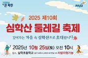 (케이엠뉴스) 파주시 교하동 주민자치회는 오는 25일 10시, 심학초등학교에서 ‘2025년 제10회 심학산 둘레길 축제’를 개최한다고 밝혔다. ‘깊어가는 가을 속 심학산으로 초대합니다’를 주제로 열리는 이번 행사는 가족이 함께 걷고 즐기는 가을맞이 지역 축제로, 심학산의 아름다운 둘레길을 배경으로 다양한 프로그램이 진행될 예정이다. 이날 축제는 오전 10시 식전 공연을 시작으로, 11시 개막식이 진행된다. 축제 현장에는 체험공간, 먹거리 장터, 농산물 직거래 장터, 풍자화(캐리커처) 무료 체험(선착순 30명) 등 풍성한 볼거리와 즐길 거리가 마련된다. 또한 경품 추첨과 노래자랑 등 참여형 행사도 진행되며, 75인치 발광다이오드(LED) 텔레비전 등 푸짐한 경품이 준비돼 있다. 특히 올해 축제에는 파주시 홍보대사이자 초대가수 김대훈이 출연해 신나는 무대를 선보일 예정이다. 박용호 교하동 주민자치회장은 “올해로 10회를 맞은 심학산 둘레길 축제는 주민이 주도하는 교하동의 대표 축제로 자리 잡았다”라며 “마을회관에서 행사장까지 차량 지원을 제공하는 등 많은 주민들이 불편 없이 참여할 수 있도록 철저히 준