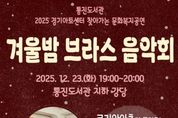 (케이엠뉴스) 김포시 통진도서관은 오는 12월 23일 저녁 7시부터 8시까지 다가오는 연말을 기념하여 온 가족이 함께 즐길 수 있는 브라스 음악공연을 운영한다. 이번 공연은 경기아트센터에서 지원하는 ‘찾아가는 문화복지공연’ 사업으로, 김포시 북부권 시민들을 대상으로 일상 가까이에서 문화예술을 만나는 기회를 제공하고, 지역 간 문화 격차를 완화하고자 기획했다. 이번 공연은 금관 5중주로 구성된 앙상블 코리안아츠의 풍성한 선율로 채워질 예정이며, 코리안아츠는 대한민국 국제관악제 홍보대사와 2018년 평창동계올림픽 개막식 《승리의 팡파레》를 연주하는 등 화려한 이력을 지닌 팀으로, 클래식은 물론 영화와 대중음악 등 다양한 장르를 넘나들며 새로운 음악적 시도를 이어가고 있다. 도서관 관계자는 “이번 공연은 영화 및 애니메이션 음악공연으로 누구나 쉽게 즐길 수 있으며, 이번 공연을 통해 온 가족이 따듯한 연말을 보내길 바란다”라고 말했다.