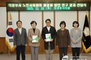 (케이엠뉴스) 의정부시의회 ‘의정부시 노인사회참여 연구회’가 18일 연구용역 최종 결과를 집행부에 전달했다. 의정부시 노인사회참여 연구회는 조세일 대표의원과 김연균 의원, 정미영 의원으로 구성된 의원 연구단체로, 노인의 사회참여 현황과 효과를 분석하고 지역 맞춤형 정책 방안을 제시함으로써 노인의 삶의 질 향상과 세대 통합, 지역 공동체 회복을 위해 지난 5월부터 연구 활동을 돌입해 11월 연구 용역을 마쳤다. 연구회는 노인 관련 총괄 부서인 노인복지과에 노인의 사회참여 유형을 분류하고 방안을 제시하는 등에 대한 연구 결과를 토대로 작성된 연구용역 결과 보고서를 전달했다. 조세일 대표의원은 “이번 연구 결과를 바탕으로 담당부서와 협력하고 소통하여 노인사회참여 방안을 실체화하고 추진해 나갈 예정이다”라며, “고령사회 속에서 다양한 세대가 함께 공존할 수 있는 기반이 조성되길 바란다”라고 밝혔다.