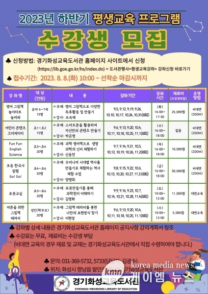 (케이엠뉴스) 경기화성교육도서관이 ‘평생교육 프로그램’ 참여자를 오는 8일부터 선착순 모집한다.