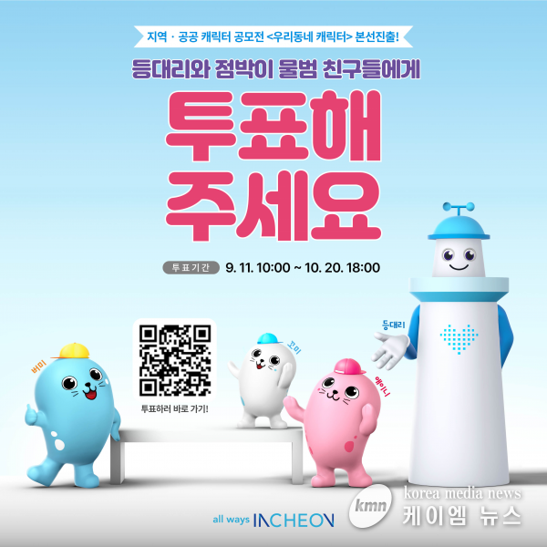 (케이엠뉴스) 인천광역시는 시 브랜드 마스코트인 ‘등대를 사랑하는 점박이물범 친구들’ 캐릭터가 한국콘텐츠진흥원에서 주최하는 ‘제6회 우리동네 캐릭터 대상’ 본선에 진출했다고 11일 밝혔다.