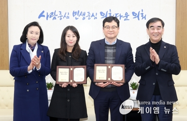 (케이엠뉴스) 경기도의회 여성가족평생교육위원회 정윤경 의원이 9일 경기도의회 의장 접견실에서 열린 청소년 노동인권 발전 유공자 표창 수여식에 참석해 청소년 노동인권 발전에 이바지한 교육 강사의 의장 표창 수상을 축하했다.