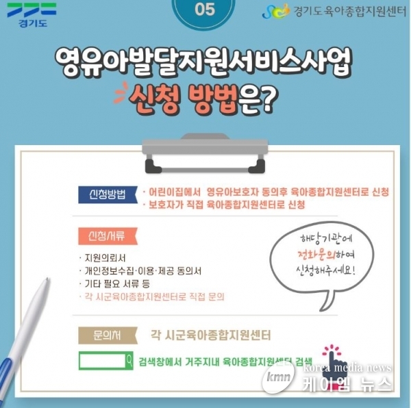 ‘경기도 영유아 발달지원서비스’는 영유아의 발달 지연을 조기 발견해 발달 지연 무료 선별검사, 양육 상담, 치료 연계 등 영유아의 건강한 성장을 지원하는 내용이다.