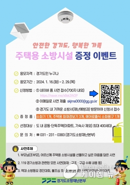 경기소방은 3월 초 심의를 거쳐 사연 우수작에 선정된 최대 400명에게 단독주택과 공동주택에 가구당 화재경보기 3개와 소화기, 에어로졸식 소화용구 각각 1개를 설치해 준다.