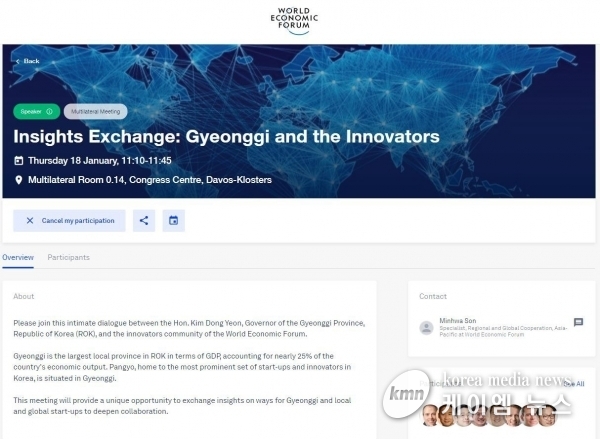 김동연 지사는 현지 시각 밤 11시 30분 누리소통망 생방송을 통해 “재밌는 일이 벌어졌다 세계경제포럼에서 저를 초청하는 유니콘기업 세션을 만들었다 이게 안내 홈페이지”며 세션 개최 소식을 전했다 초청 안내 페이지에는 ‘경기도와 혁신가들’을 주제로 현지 시각 18일 오전 11시 10분 다보스클로스터스 콩그레스 센터에서 세션이 열린다는 내용이 담겨 있다.
