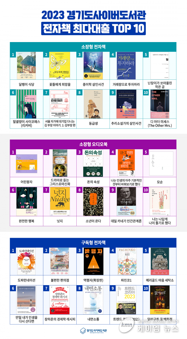(케이엠뉴스) 경기도사이버도서관이 ‘2023년 전자책 대출통계’를 분석한 결과 지난 한 해 동안 경기도민에게 가장 인기가 높았던 전자책 1위는 오가와 이토 작가의 ‘달팽이 식당’인 것으로 나타났다.