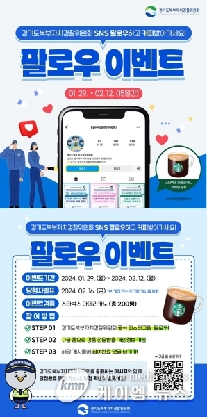(케이엠뉴스) 경기도북부자치경찰위원회는 도민들과 소통과 교감을 강화하기 위해 공식 누리소통망인 인스타그램 팔로우 이벤트를 실시한다.