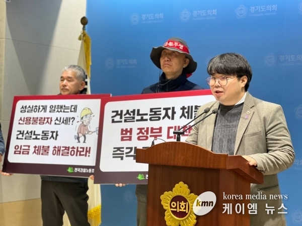 (케이엠뉴스) “임금 체불은 삶을 망가뜨립니다”경기도의회 도시환경위원회 유호준 의원은 1일 경기도의회 기자회견장에서 민주노총 건설산업노동조합연맹 전국건설노동조합과 함께 ‘건설기계노동자 체불 해결 촉구 기자회견’을 진행했다.