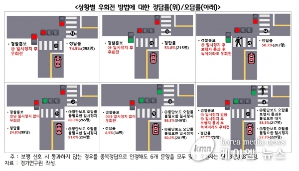 하지만 설문조사에서 경찰청 홍보물을 기준으로 법적으로 올바른 우회전 통행방법에 대한 테스트를 시행한 결과, 우회전 방법에 대해 정확히 인지하고 있는 운전자는 400명 중 1명에 불과했다.