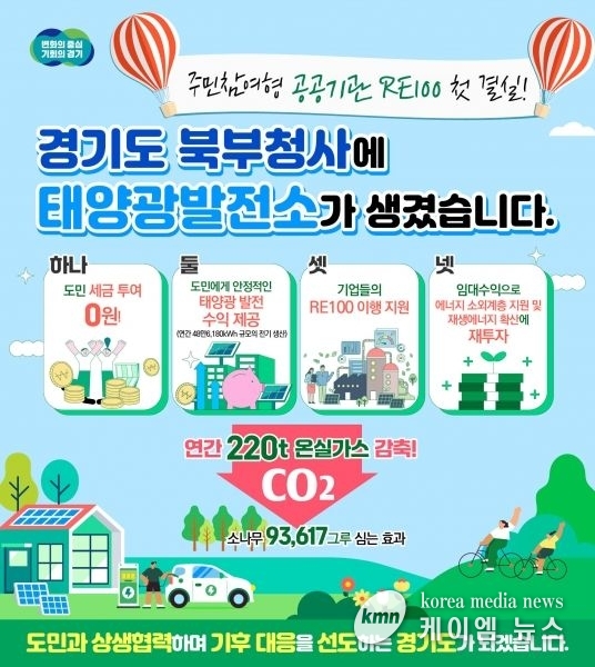 경기도는 북부청사 본관과 별관 옥상, 보건환경연구동 옥상, 관용차량 주차장에 360kW 규모의 태양광 발전시설을 설치하면서 경기도 RE100정책에 대한 도민 공감대 형성을 위해 도민 참여형 사업으로 진행됐다.