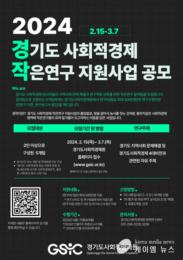 (케이엠뉴스) 경기도사회적경제원이 경기도민 또는 사회적경제 현장 및 학계 전문가의 연구 활동을 지원하는 ‘2024 경기도 사회적경제 작은연구 지원사업’ 참여자를 3월 7일까지 모집한다.
