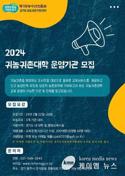(케이엠뉴스) 경기도와 경기도농수산진흥원이 운영하는 경기도귀농귀촌지원센터가 ‘2024 경기귀농귀촌대학’ 교육 대행기관을 22일부터 29일까지 공개 모집한다.