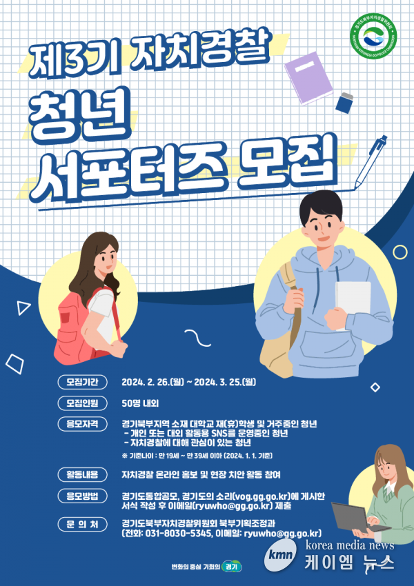 (케이엠뉴스) 경기도북부자치경찰위원회는 자치경찰에 대한 홍보와 치안캠페인 등 현장 활동을 할 ‘제3기 경기북부 자치경찰 청년 서포터즈’를 2월 26일부터 다음 달 25일까지 1달간 공개 모집한다.